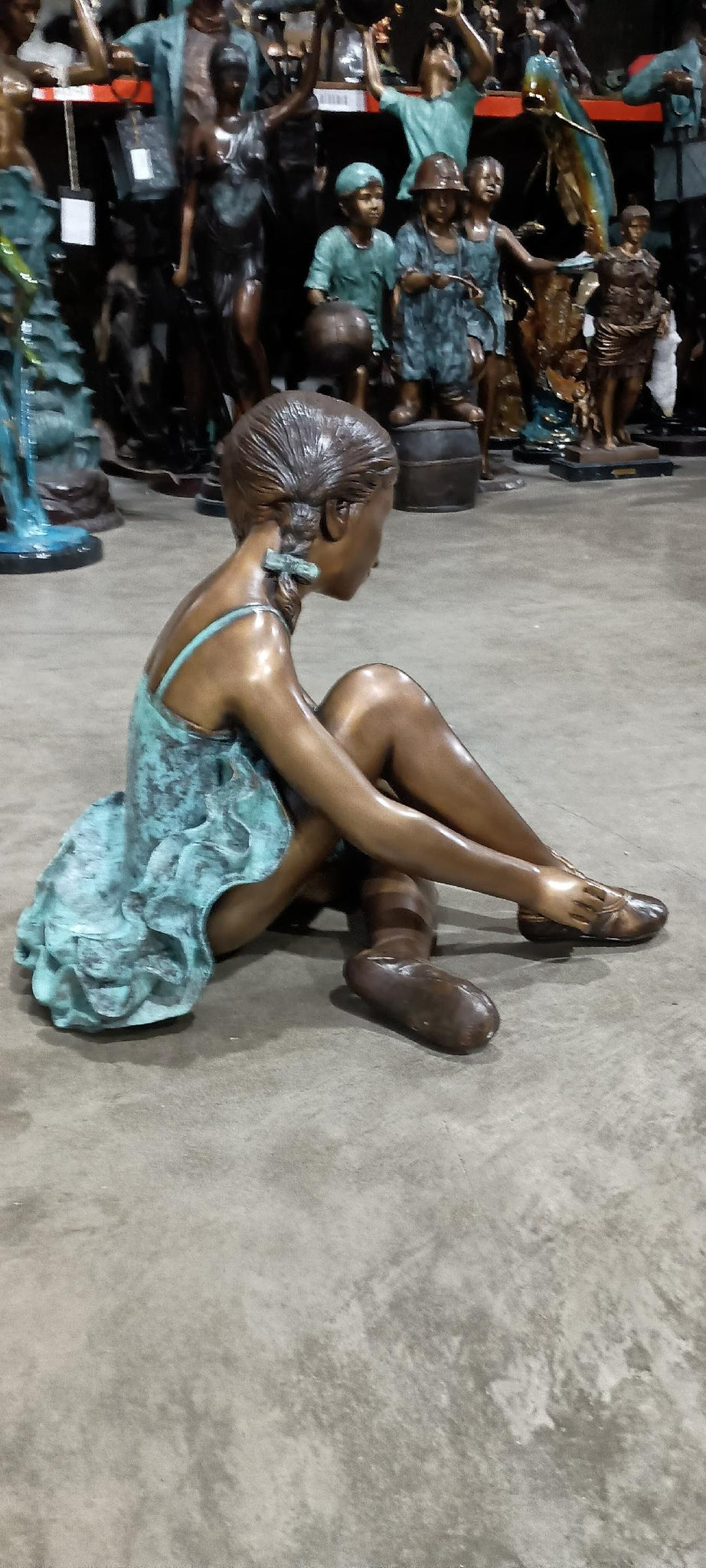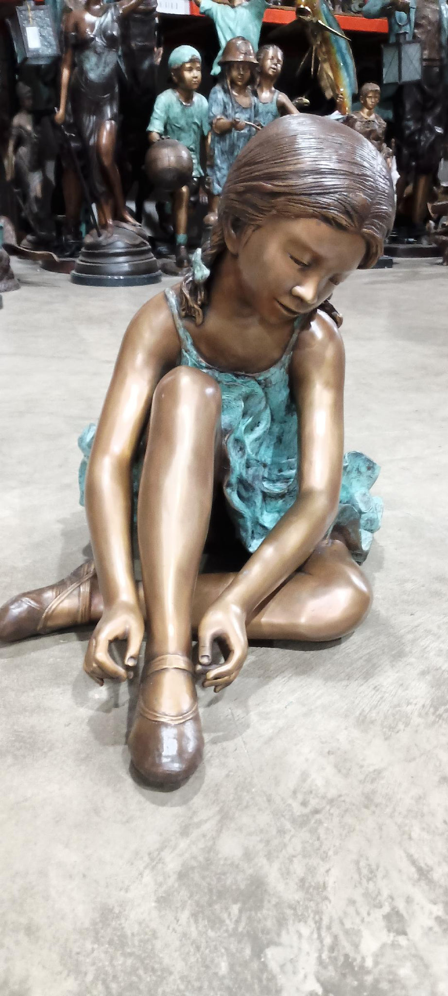 Add timeless elegance to your space with this bronze ballerina statue—a beautifully detailed sculpture of a young girl preparing for her first ballet recital. Captured in a seated pose as she gracefully ties her ballet slippers, this bronze ballet dancer figurine exudes charm, innocence, and artistic beauty. Her ruffled tutu, neatly styled hair, and delicate posture highlight the poise and discipline of a true ballerina. Meticulously handcrafted using the traditional lost wax casting method, this fine art bronze sculpture is finished in a rich, warm patina that enhances its lifelike detail.