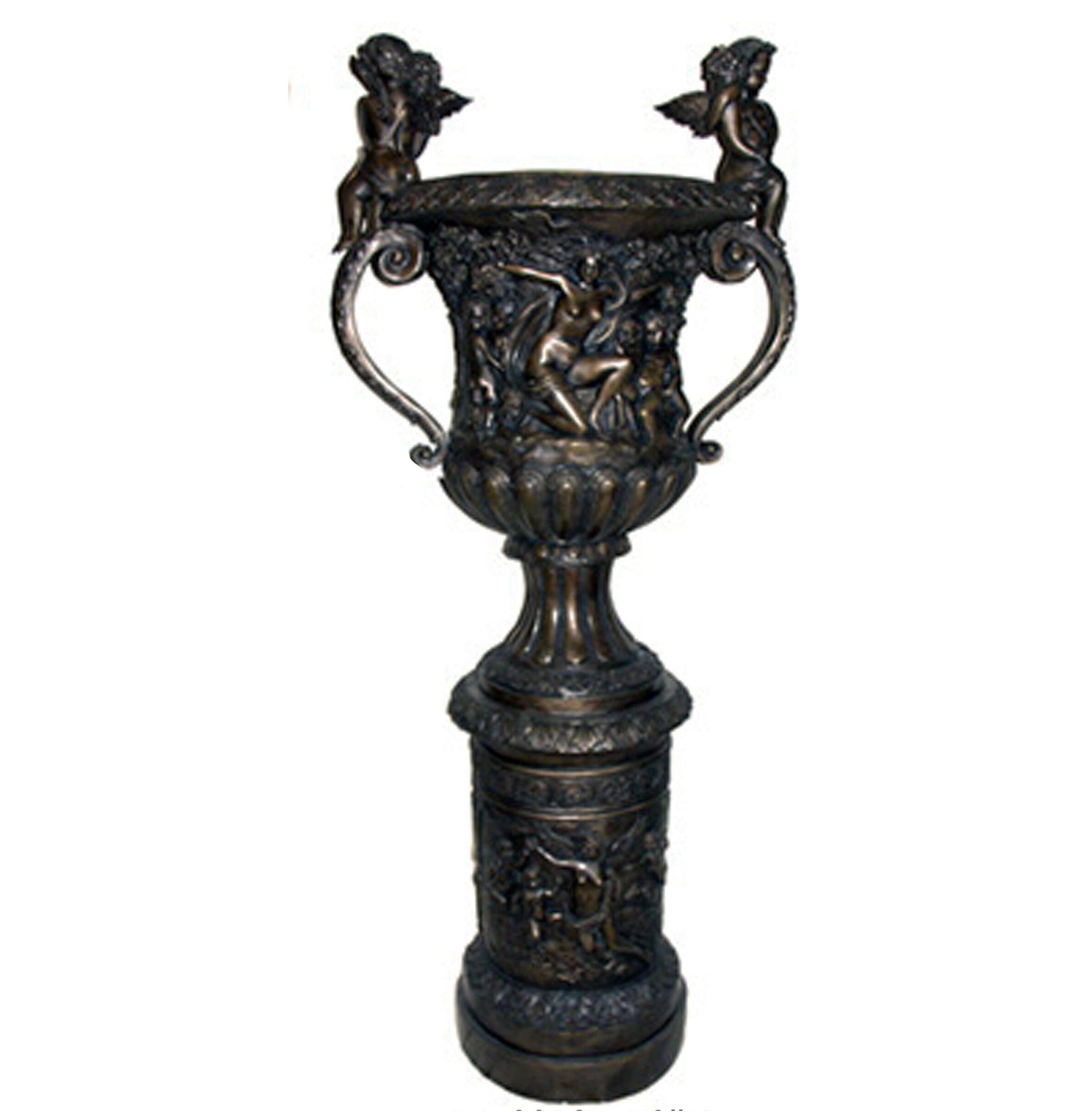 Elevate outdoor spaces with this large bronze garden urn on pedestal, a 73 inch tall statement planter inspired by classical Greek art. This two handle bronze urn features rich relief scenes depicting daily life in ancient Greece, finished with an authentic distressed patina for an antique look. Ideal as a focal point for landscape design, garden decor, courtyard accents, or luxury home interiors, this oversized bronze planter guides visual interest throughout your yard or entryway. Each Greek style bronze urn is hand finished, hand detailed, and cast using the traditional lost wax bronze casting process for lasting durability. The sculpted pedestal base displays intricate floral patterns and human figures, adding depth and elegance. Designed for homeowners searching for premium bronze garden urns, classical outdoor planters, and timeless garden statues for sophisticated American landscape design projects.