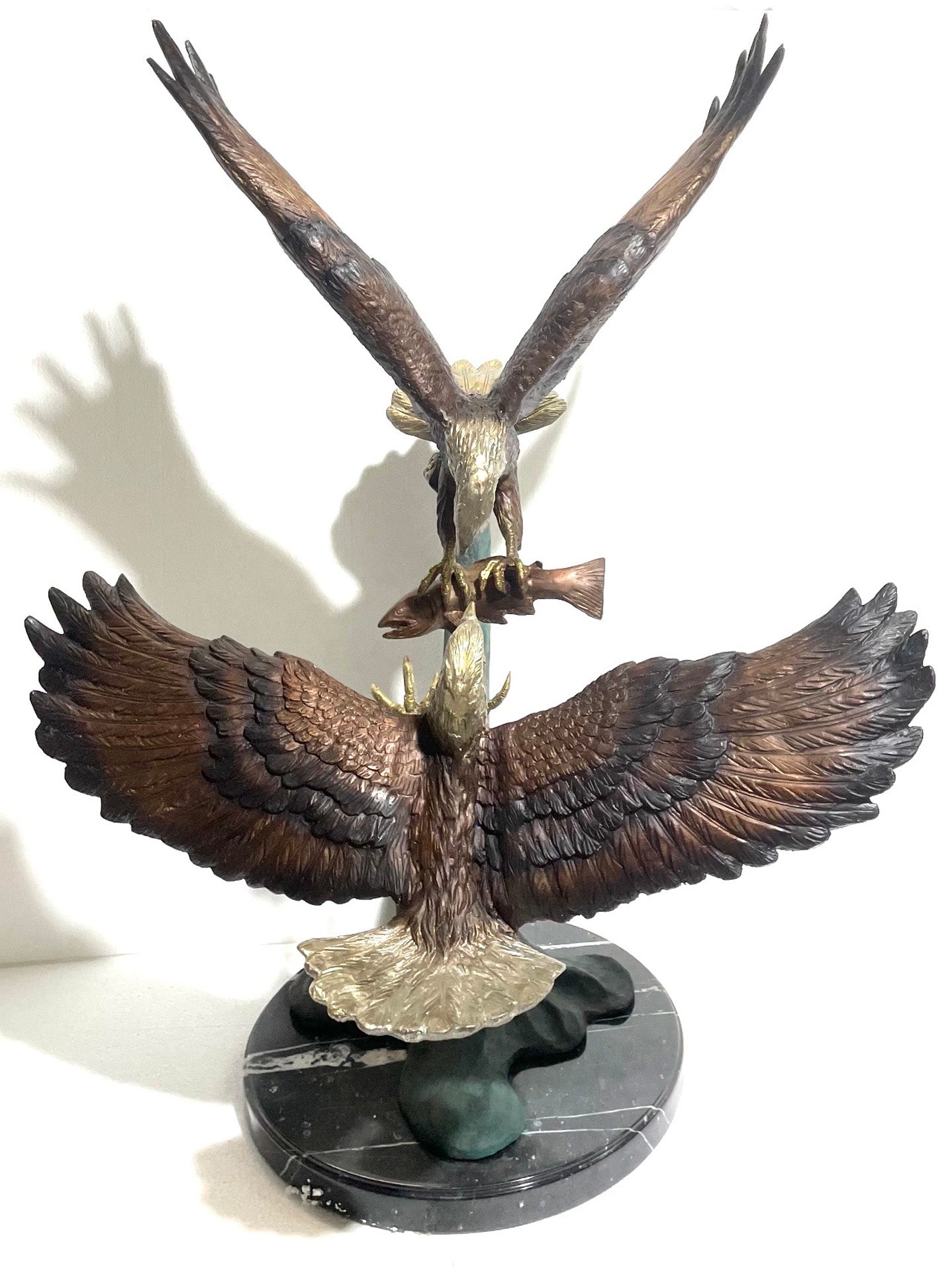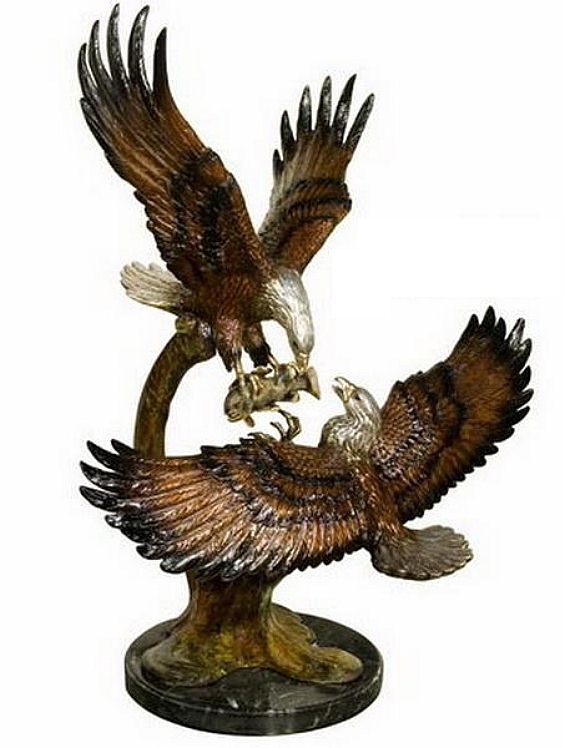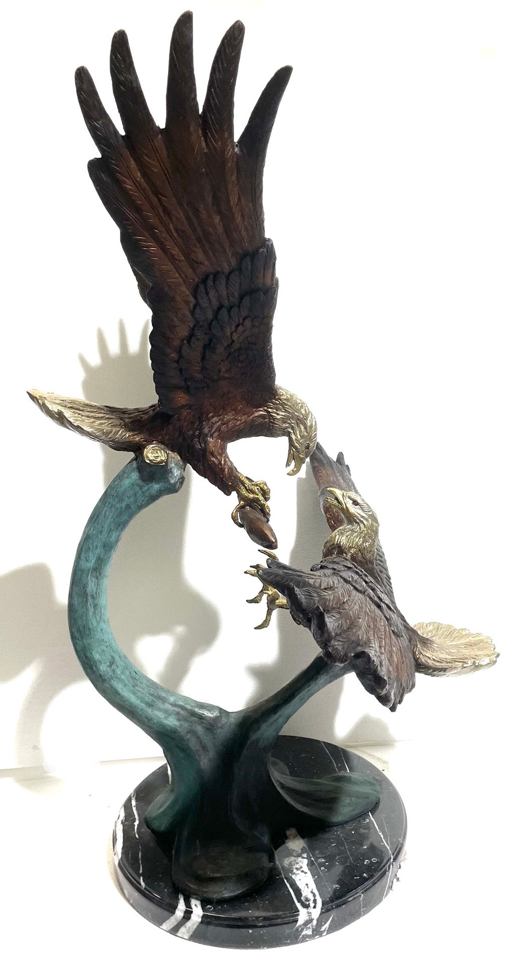 Two eagles contest in this dramatic large American bald eagle sculpture highlighting their opportunistic tendencies to seek control. Cast in bronze using the lost wax process and then hand finished to deliver character and vivid, pristine details, our bronze eagle sculpture of two fighting eagles not only adds a wildlife theme to the home or office, but highlights the display of power and acuteness of the American eagle when taking charge of its possession.