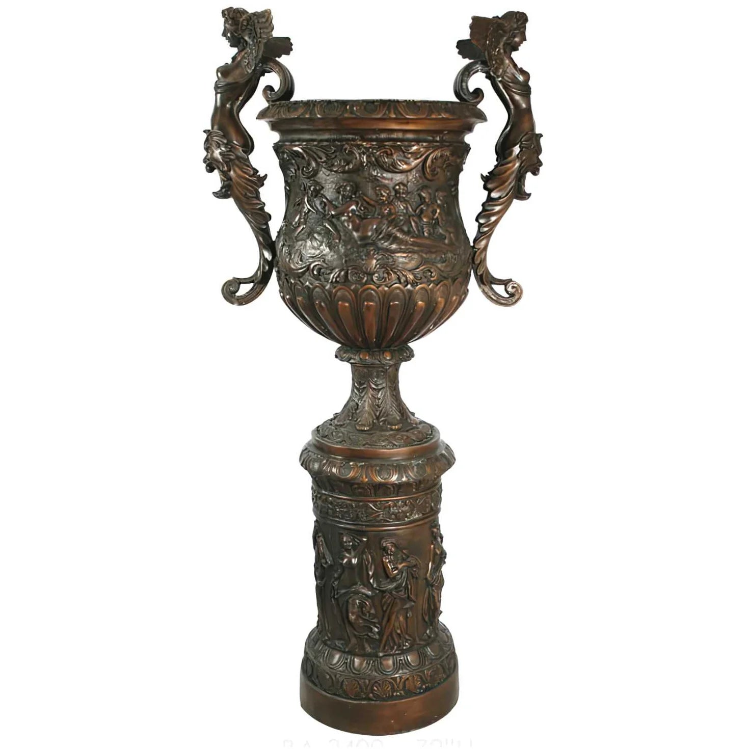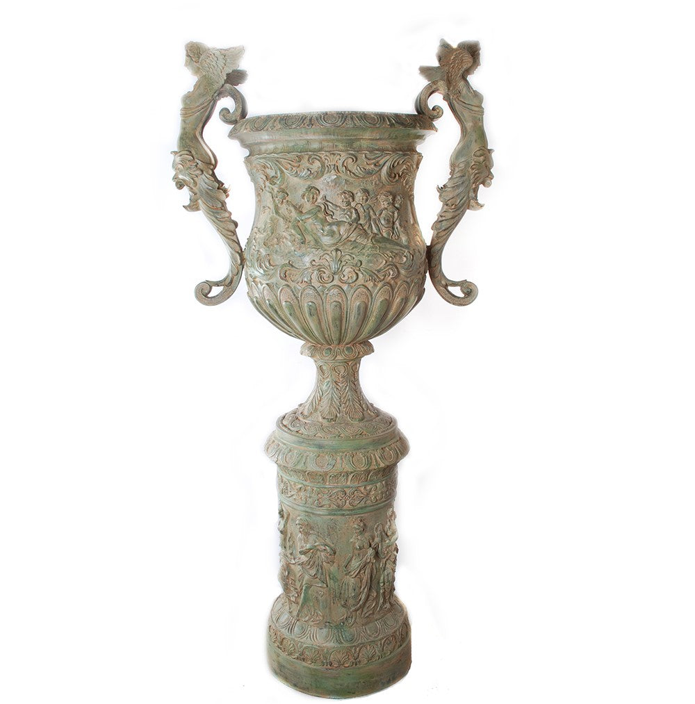 Enhance your outdoor space with the Grand Estate two handled bronze garden urn, a statement Roman style bronze urn designed for classic American landscapes. This outdoor bronze urn with pedestal features sculpted human figures, ornate floral motifs, and flowing leaf details that bring timeless elegance to patios, courtyards, and estate gardens. Expertly handcrafted, each bronze garden urn is hand detailed by an artisan and hand finished for a rich, aged look that elevates garden decor and landscape design. Ideal as a focal point or luxury outdoor planter, this courtyard bronze urn delivers durability and heirloom quality.