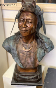 Bronze Native Indian Warrior Chief Cochise Bust Statue with Wolf - 31”H